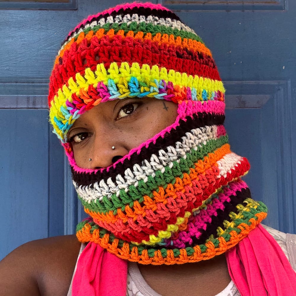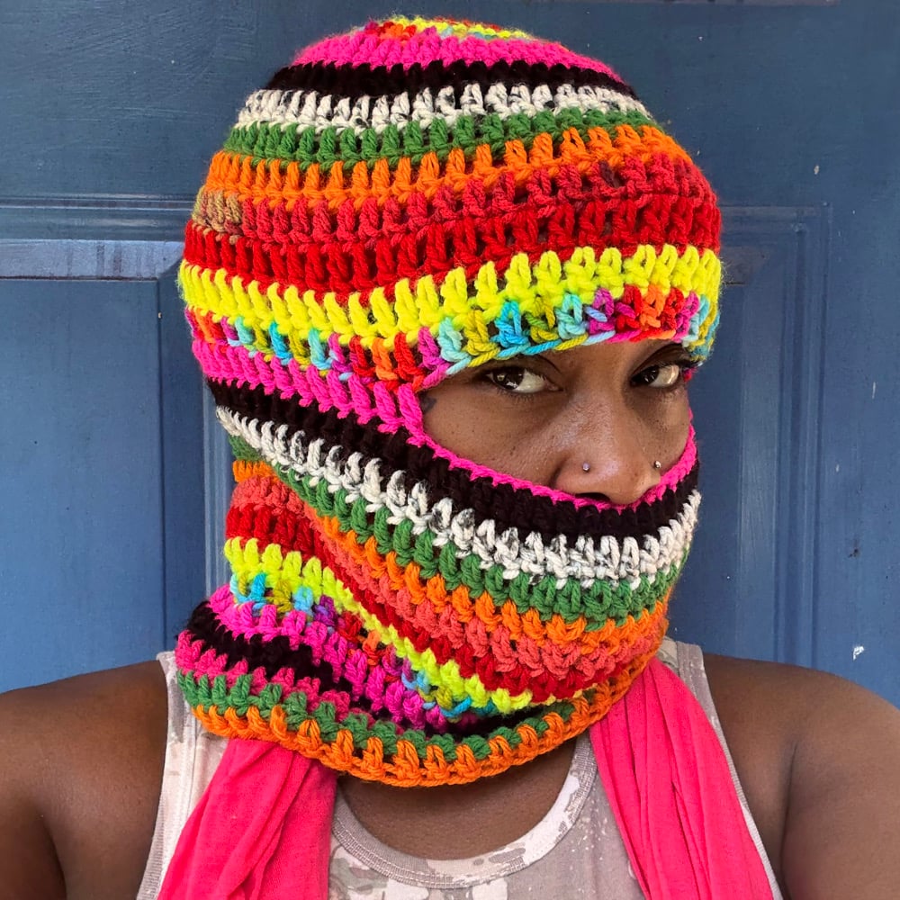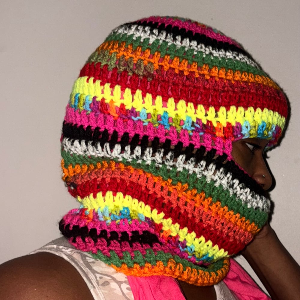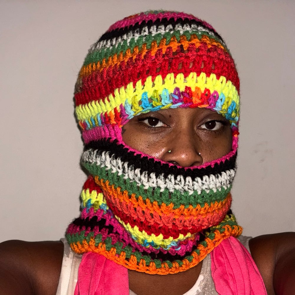 i have an embarrassing amount of scrap yarn so im forcing myself to use it before anything else. first piece in the scrap yarn purge is this ski mask. 100% acrylic. handwash and dry flat